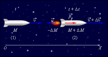 $$ M\overrightarrow{v} = (M+\Delta M)(\overrightarrow{v}+\Delta\overrightarrow{v}) - -\Delta M(\overrightarrow{v}+ \overrightarrow{u}) \;\;\text{или} \;\;\; M\Delta\overrightarrow{v} = \Delta M\overrightarrow{u}-\Delta M\Delta\overrightarrow{v}$$Величиной \(\Delta M \Delta\overrightarrow{v}\) можно пренебречь, так как |ΔM| << M. Разделив обе части последнего соотношения на Δt и перейдя к пределу при Δt → 0, получим: